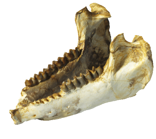 The Fossil of the Month is a lower jaw of Plagiolophus minor, a small palaeothere species. The jaw was recovered in 1969 from a karst fissure in Middle Franconia. Compared to modern horses, the jaw of Plagiolophus is shorter and has less attachment surface for the masticatory muscles. This is related to the softer, more nutritious, and easier-to-digest diet of the palaeotheres, which could be processed even without extreme adaptations in the masticatory apparatus. The marbled coloring of the jaw resulted from varying degrees of mineralization during the fossilization process.