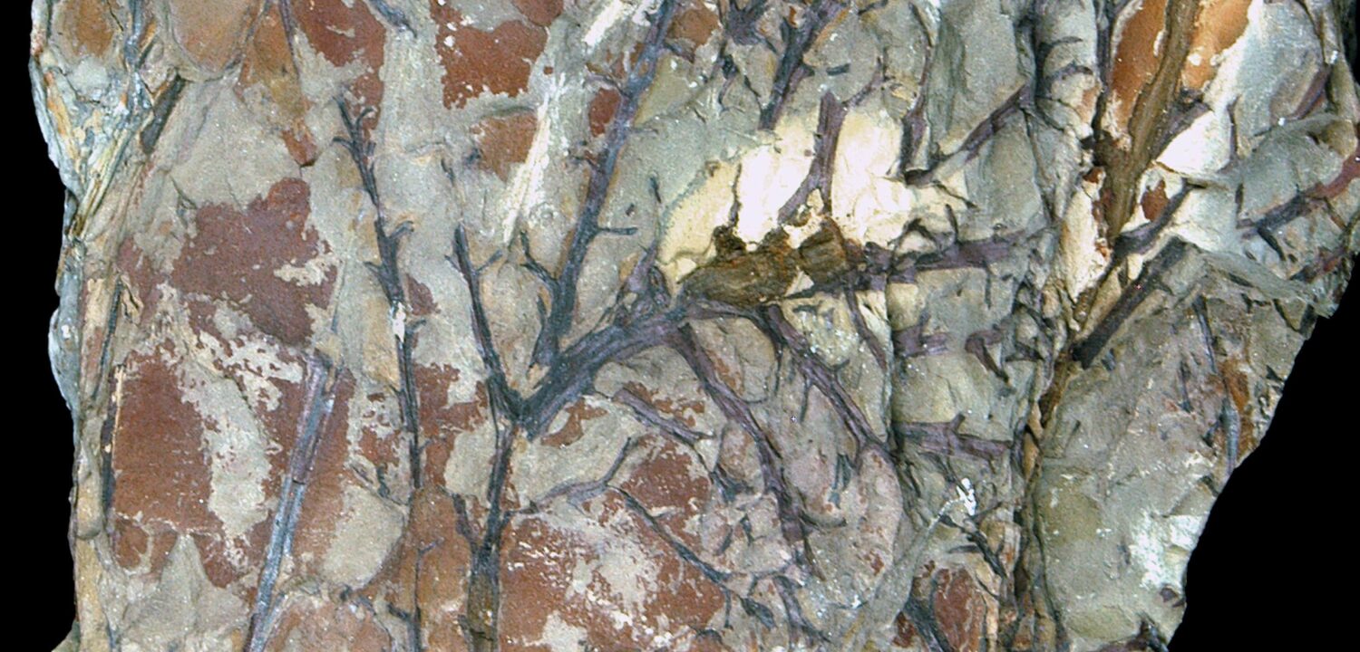 The oldest progymnosperms are the Aneurophytales. An important representative of this group is Aneurophyton germanicum, the species that gave the order its name and our fossil of the month, which is known from the Middle and Upper Devonian of Europe and North America. Reconstructions show the plant as a fern-like tree that did not have flat fronds or leaves, but instead had systems of branches which extended in three directions (three-dimensionally), spirally arranged on the trunk and with short, forked terminal branchlets. The fossil of the month shows part of such a branch system. The specimen comes from the former Kirberg quarry in Wuppertal-Elberfeld. Geologist and paleobotanist Hermann Weyland of Cologne had discovered a rich Middle Devonian flora there in the 1920s and subsequently described it scientifically with his Frankfurt colleague Richard Kräusel.